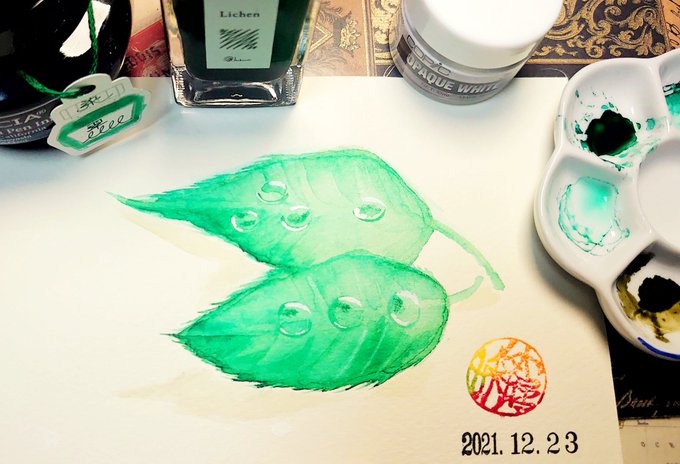 🐸 #作画塾 🐺 #003 Afterより →サトウヒロシ(@salty_f)先生 「葉っぱ🍀」 🎨#カキモリ 様 (@kakimori_krme)(@kakimori_oka)「#Lichen」 🎨#すなおいろ 「翠」 ☃️#OPAQUEWHITE #妖画 #万年筆ラクガキ #水彩画 #万年筆イラスト部 #インク沼 #イラスト好きと繋がりたい twitter.com/salty_f/stat…