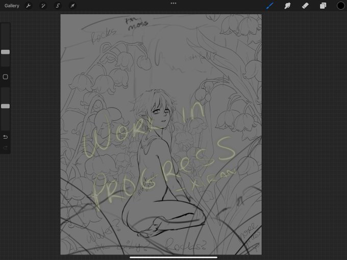 WIP from today's stream. Still not sure what she's sitting on. Probably some kinda lily. Maybe rocks. Water seems like overkill. Probably gonna be dark-ish BG. Hair color???? #artistsoftwitter #artistsontwitter #animeart #myart #mydrawing #sketch #lilyofthevalley #flowers #fairy