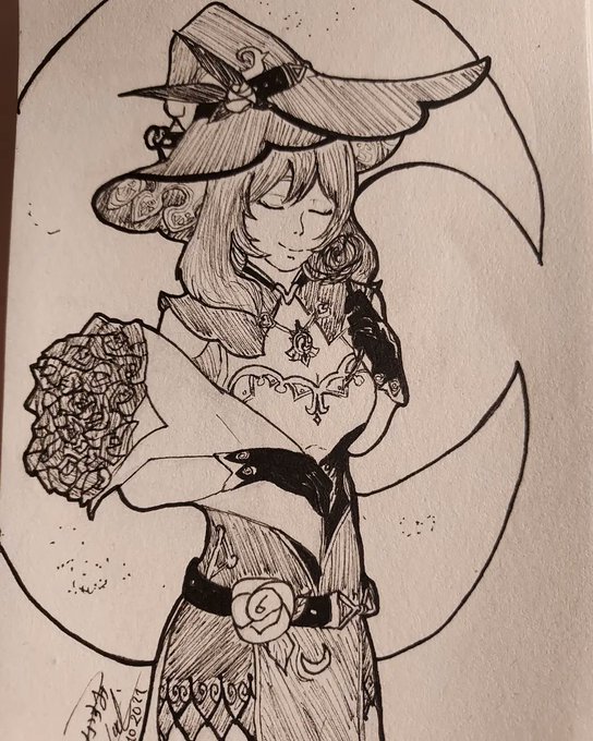 Sixième jour de l'inktober 2022 ✒️ Le thème d'aujourd'hui est "bouquet", notre délicate Lisa semble apprécier ce beau bouquet de roses 💐🌹 #inktober2022 #GenshinImpact #lisagenshinimpact