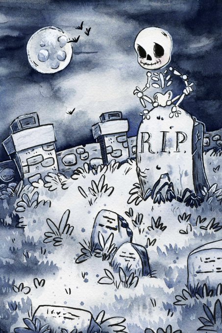 Day 9// Upon entering the nearby graveyard, Little Witch spied a skeleton resting on a headstone. “Hello Skeleton!” “Hello Little Witch! What can these dusty bones do you for?” Skeleton held out a hand in greeting. #littlewitch #inktober2021 #kidlitart
