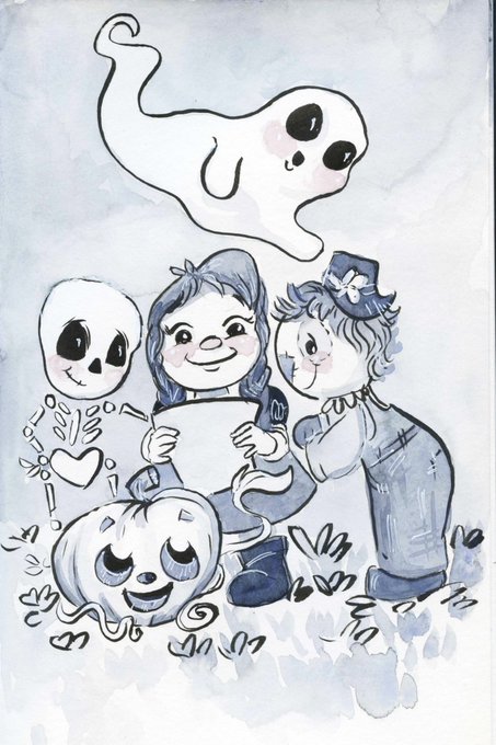 Day 19// Little Witch was so happy! She had all the ingredients for her friend potion. With help from Skeleton, Pumpkin, Ghost, and Scarecrow, she checked the spell book one more time. You can never be too careful! #littlewitch #kidlitart #inktober #inktober2021
