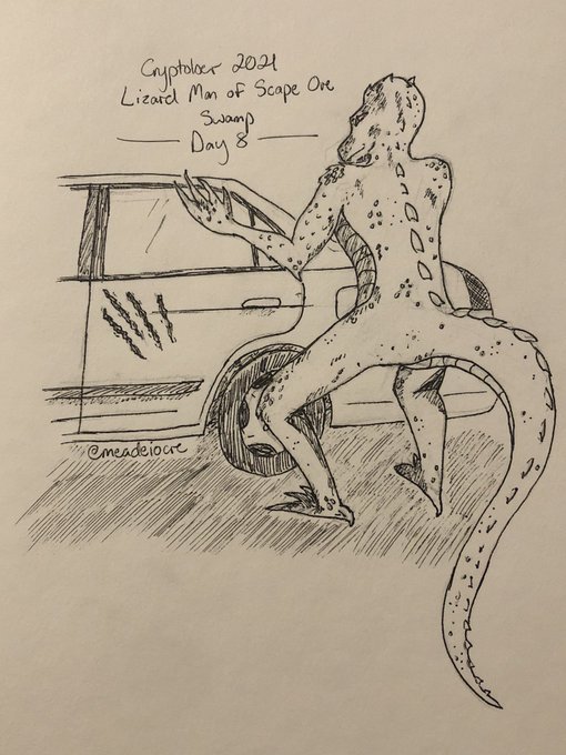 “…reports of a large lizard-like creature and a trail of unusual scratches found on cars parked close to the swamp…” #cryptober2021 #inktober2021 #lizardman #lizardmanofscapeoreswamp