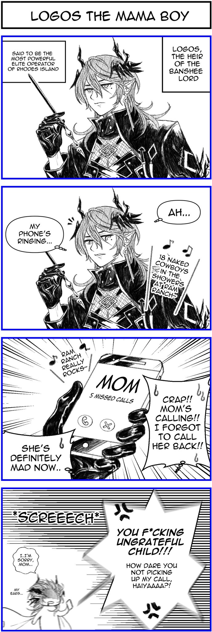 Just a typical Asian mother-son relationship dynamics...no matter how strong and powerful Logos is, mom is still the one with the highest hierarchy 🤣 <---read from right to left #Logos #明日方舟 #Arknights #ArknightsFanArt #アークナイツファンアート
