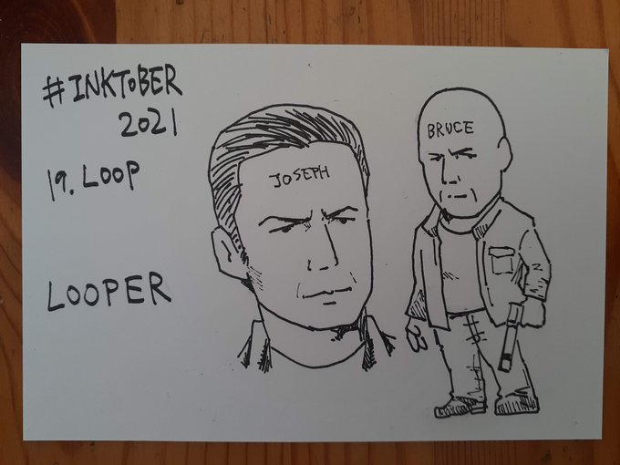 インクトーバー19日目:お題「loop」 作品「LOOPER」 ジョセフ・ゴードン・レヴィットが年取ったらブルース・ウィリスになっていたというお話。 エミリー・ブラントが良かったです。 #inktober2021day19 #inktober #インクトーバー2021 #fountainpen #looper