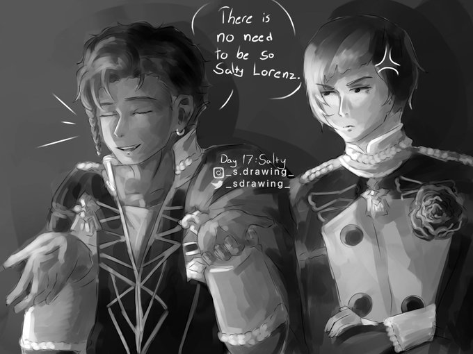 Inktober day 17: Salty!🖤 When I first saw this prompt, the idea of Claude annoying Lorenz, and making him salty came to my mind. So enjoy this!😂 #inktober #inktober2022 #claudevonriegan #lorenzhellmangloucester #fireemblemthreehouses