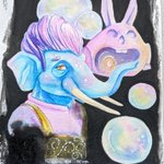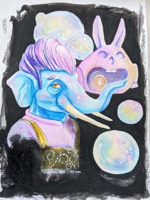 Droozh, a non-binary Loxodon Artificer. Bunny's Ballistic Bubbles are their preferred method of destruction, but they're not afraid of fireballs. Droozh's primary outfit is a set of shimmery lederhosen, just because. 🤩 #dndart #dnd5e #loxodon #artificer #watercolor #art