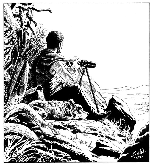 Inktober day 28 - 'Camping' "Two days ago, I saw a vehicle that would haul that tanker. You want to get out of here? You talk to me." A lovely meat and veggies dinner in the Outback at the end of the world. #inktober2022 #madmax