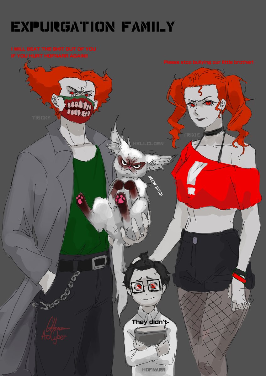 This idea suddenly pops up in my mind. I decided to draw it. Chaotic twins overprotecting their genius little brother with their pet grumpy cat. #madnesscombattricky #madnesscombatfanart