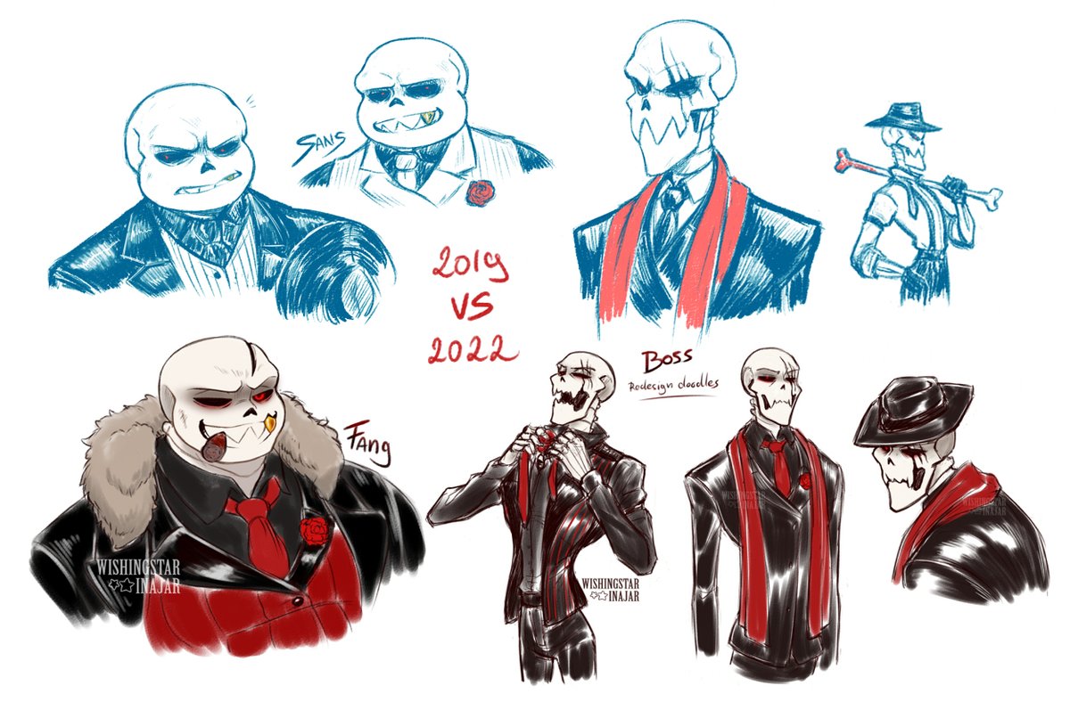 For shits and giggles. Have a comparison between my first time ever drawing Sans and Papyrus in 2019 for my own #Mafiafell fanfic versus how the boys look now in 2022. Big credit to the "Sooner or Later" comic that inspired and yeeted me into the fandom back then. #undertaleAU