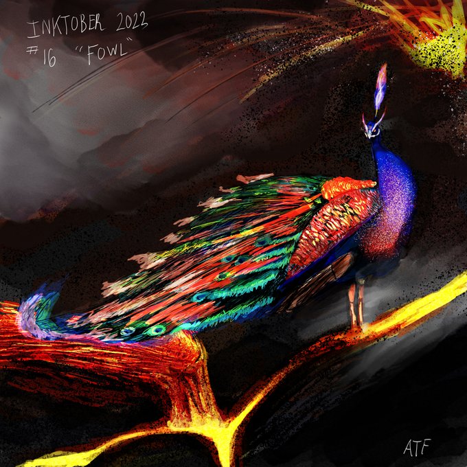 Here is the drawing for today, "Fowl". Felt like a peacock and they can have a rather "fowl" temper. #inktober2022day16 #inktober #fowl #color #magma #fire #peacock #clipstudiopaint