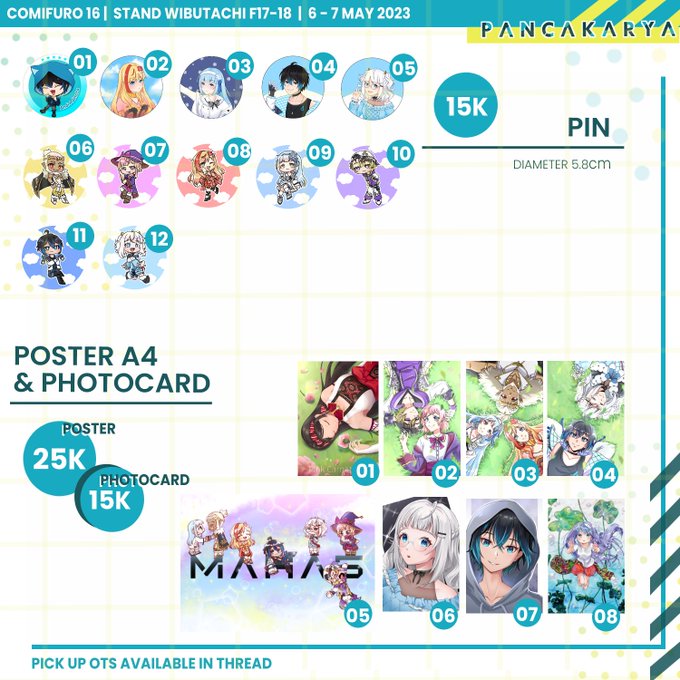 Kita juga jual Pin, Sticker set, Photocard, dan Poster A4 yang keren juga lhoo..✨✨✨ #comifuro16 #comifuro #cf16 #comifuro16catalogue #maha5 #vtuber #mayaputri_fanart #aliaadelia_art #andiadinata_art #lumicelestia_art #RenaMAHA5art #Zeni_Rupa #Niaredalion_Art #VangardoArt