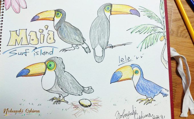 構想中のサーフィンアニメ『Mai'a Surf Island(マイア サーフアイランド)』の新キャラクターを考えた。オニオオハシ(鳥)の「lele(レレ)」 nobuyukioshima.art/2022/09/maia-s… #オニオオハシ #南国 #サーフィン #アニメ #イラスト #絵画 #絵 #キャラクター #マイアサーフアイランド #Maiasurfisland