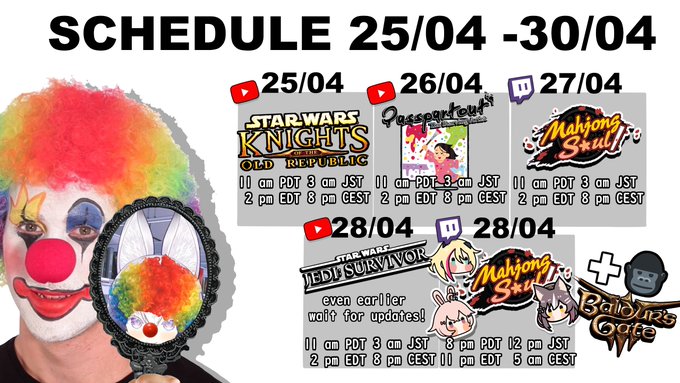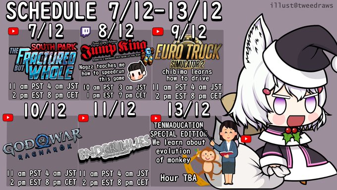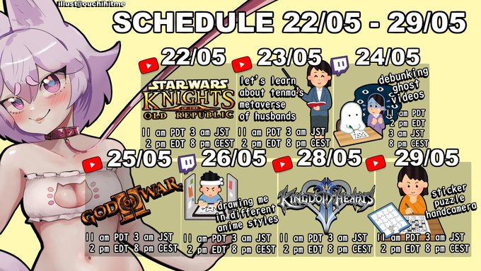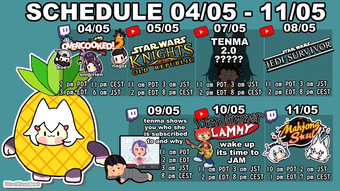 Schedule it is here!!!! Tenmaducation does not have an hour yet but I will announce that tomorrow!!!! 🔴LIVE #きつらいぶ #MaiLIVE🔴 🎨Art #お酒絵 #Artcoholic 🎨 🍻Community #kanpainiki🍻 📷Clips #maiclips 📷 🤍Memes #maimemes🤍