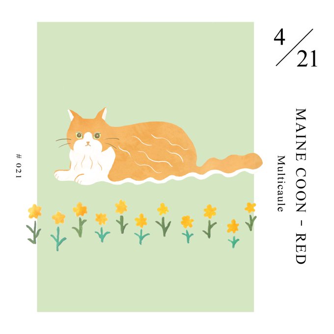 4/21 メインクーン(レッド) 誕生花 ムルチコーレ メインクーンは猫の中でも大きな品種でジェントルジャイアント(穏やかな巨人)とも言われているそうです。個人的にも大好きな猫種です🐈 #メイクーン #mainecoon #イラスト #イラストレーション #illustration #デジタルイラスト #絵 #adobefresco