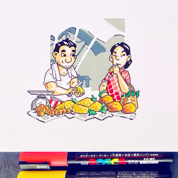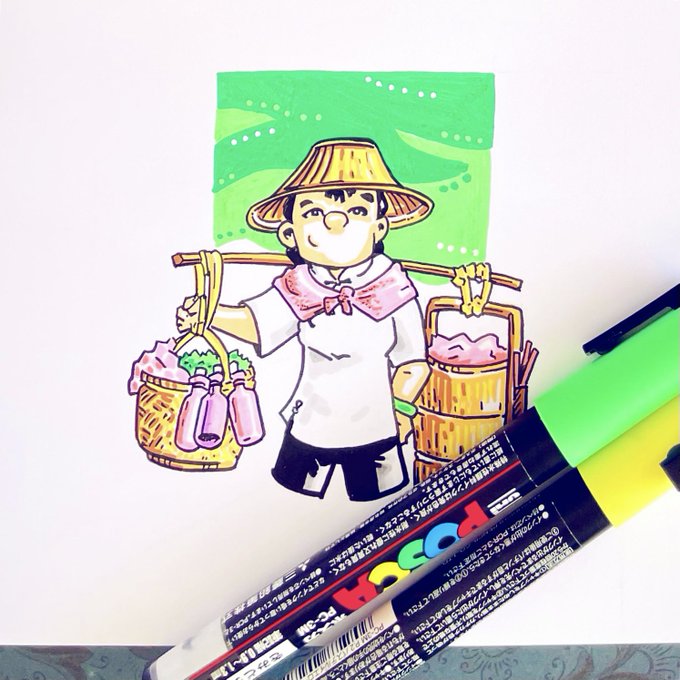 An undecided vendor wonders where to go. #illustration #childrensbookillustration #artistsofsea #artistofmalaysia #poscamarkers #poscaart #traditionalart #traditionalmedia #malaya #foodvendors #acrylicmarkers #hawkers #vendors #colonialmalaya #poscapens #market #makan