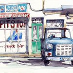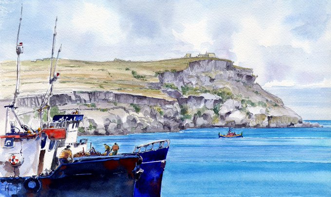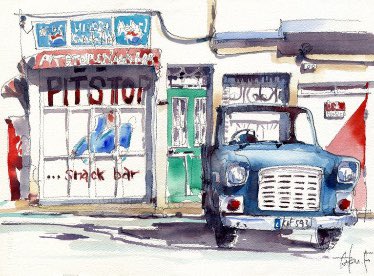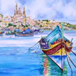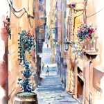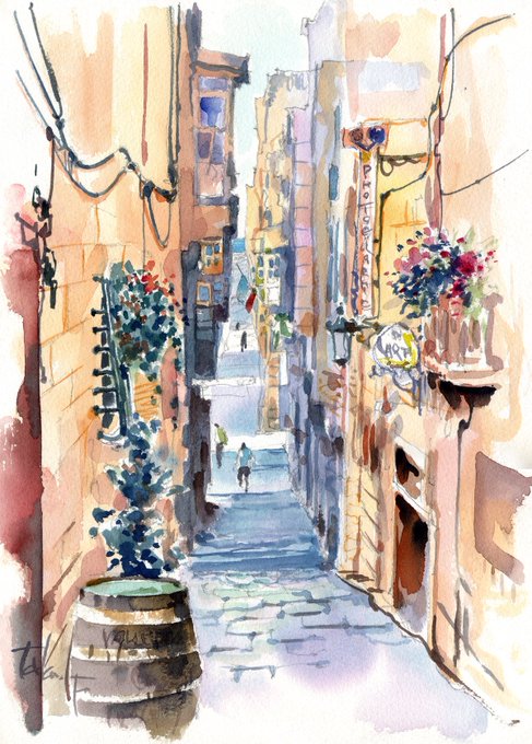「ヴァレッタの路地裏」マルタ共和国にて。 首都ヴァレッタの路地です。 土産物屋はないんだけど、レンタルビデオ屋や写真屋(どちらも今は無いだろうなあ)といった店が並んでいました。 #watercolor #路地裏 #水彩 #透明水彩 #malta #valletta #watercolorpainting