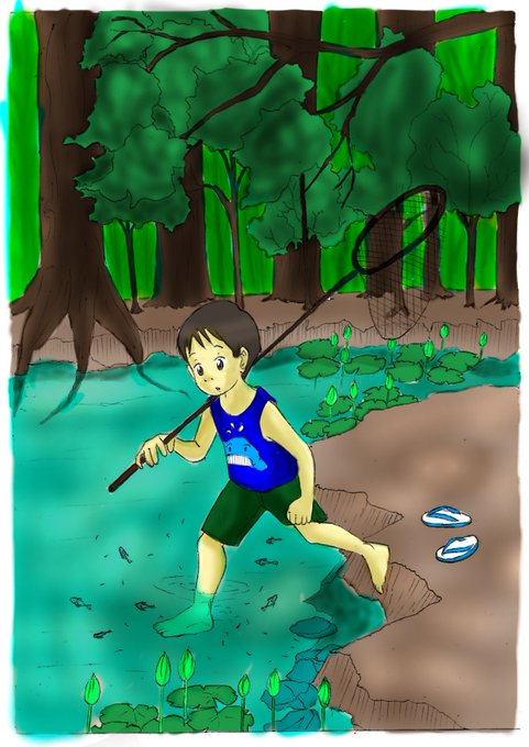 a stream covered by the shadows of trees can have colder and more delicious water, great for those who live in the tropics😄👍. #drawing #art #artistsontwitter #childrensbooks #manga #digitalpainting #originalcharacter #mangaboy
