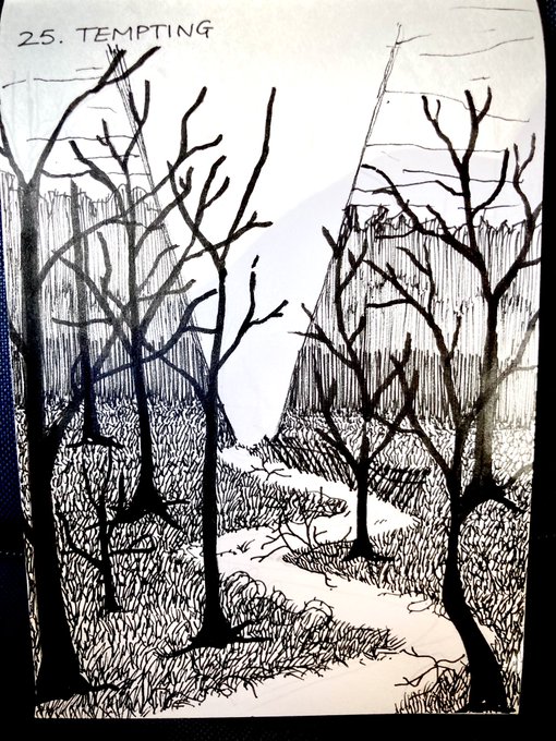 25. Tempting. Feels like a bright spot, but getting there means a lot of drawbacks. I think tempting implies hesitation, still wouldn’t know if it’s worth it though. #inktober #inktober2022 #illustration #art #sketch #sketchbook #pendrawing #penandink #darkforest #markmaking