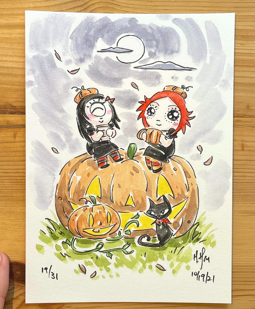#RubyGloomInktober # 19/31: ‘Pumpkin’ 🎃 “Tis the season… for pumpkin spice!” - #RubyGloom 👁 Original artwork & prints by Martin Hsu for sale daily on martinhsu.bigcartel.com/category/hallo… #inktober2021 #martinhsuhalloween #mabsdrawlloweenclub2021