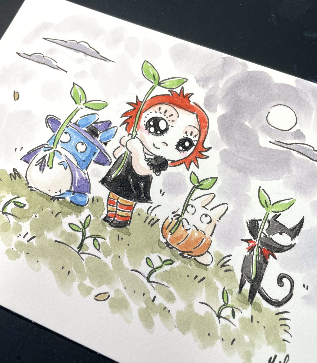 New neighbors! #RubyGloomInktober # 20/31: ‘Sprout’ 🌱 “I love doing the sprouting dance with my new neighbors!” - #RubyGloom 👁 Original artwork & prints by Martin Hsu for sale on martinhsu.bigcartel.com/category/hallo… #inktober2021 #martinhsuhalloween #mabsdrawlloweenclub2021 #totoro