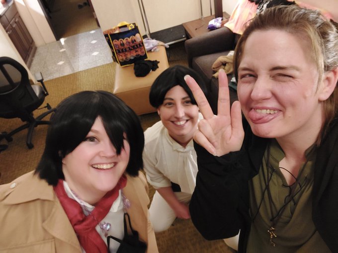 Last night was fun, exhausting and over too soon. Today we are Levi, Petra and Hange in the morning and then Jean, Armin and Sasha this afternoon/evening. #Matsuricon #cosplay #AttackOnTitan #ShingekiNoKyojin