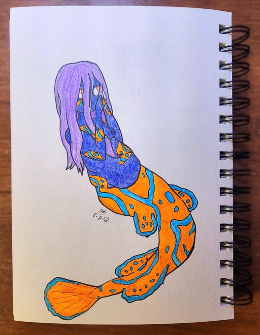 This friend's pattern and colors was inspired by the mandarinfish! Such pretty colors (Also just a little uncovered nipple not much else 👍) 𓆏 #meadowdoaart #mermay #mermay2022