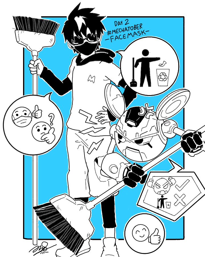 Mechatober Day 2 - Facemask Amato : today we will clean the yard, but first we put on a facemask and... huh? what's up mechabots? Mechabot : I am a destroying robot, not a cleaning robot! Amato : take it easy, it won't be long buddy. #Mechatober #inktober2021 #inktober #Mechamato