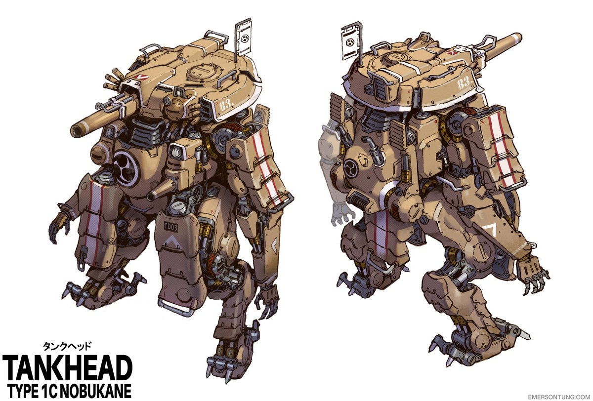 The Nobukane was an early variant of the Nobunaga that mounted a higher caliber short-range howitzer intended both as a cost-saving measure and for assault on fortifications. From my project: Tankhead. #tankhead #tankheadmecha #mechtober