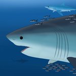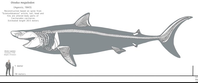 The largest shark has ever existed, Otodus megalodon. Based on latest reconstruction (Perez 2021), this massive shark could grow to a maximum length of 20.3m and weight over 60tons. There are several fossil record of O.megalodon in Indonesia #megalodon #paleoart #shark