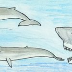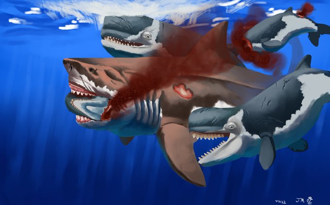 Two of the largest macropredators to ever live: #megalodon and #livyatan. The enormous shark takes a little bite out of a younger individual and the pod comes to take revenge. #paleoart #sciart #paleontology