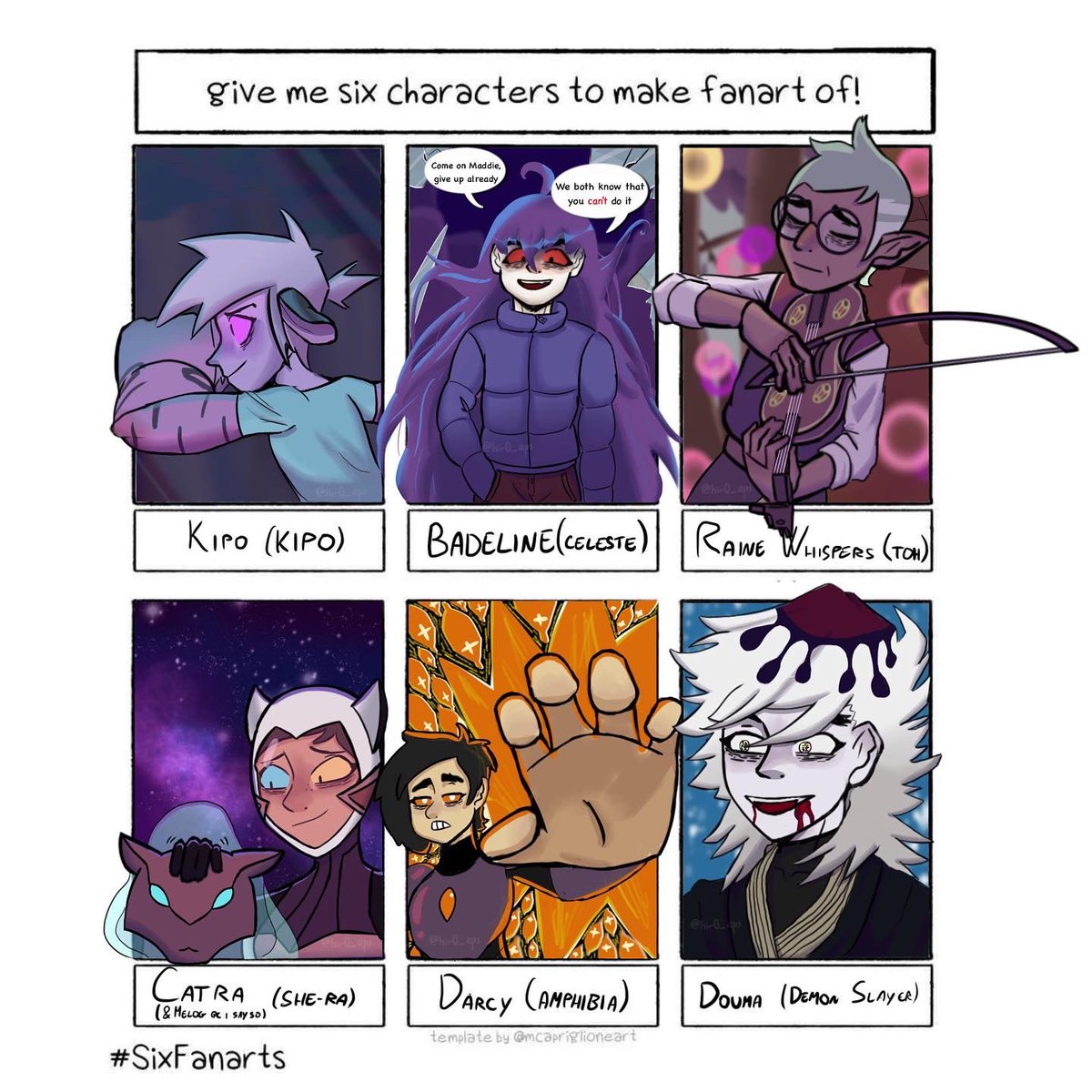I asked some characters on insta, so here ya go #SixFanarts #Kipo #kipotheageofwonderbeasts #badeline #celeste #rainewhispers #rainetoh #toh #theowlhouse #catra #melog #shera #spop #darcywi #marcywu #amphibia #douma #kimetsunoyaiba #demonslayer
