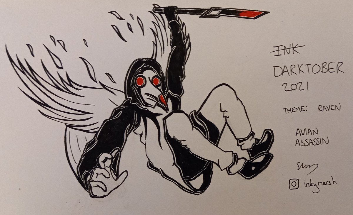 Day 5 of Inktober! A bunch of horrible things practiced in one go: hands, clothing and perspective. #inktober #inktober2021 #monsterdesign #creaturedesign #fantasyart #ink #2d #traditional #handdrawn #assassin #raven #mercenary