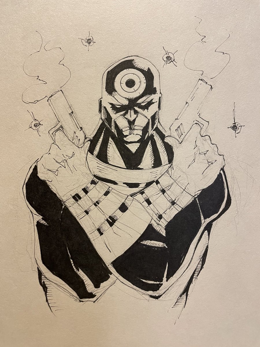 Day 12 (with an hour to spare) of Inktober. I give you Bullseye. . #art #fanart #marvel #marvelcomics #comics #daredevil #bullseye #villain #marksman #mercenary #inktober #dailysketch #ArtistOnTwitter