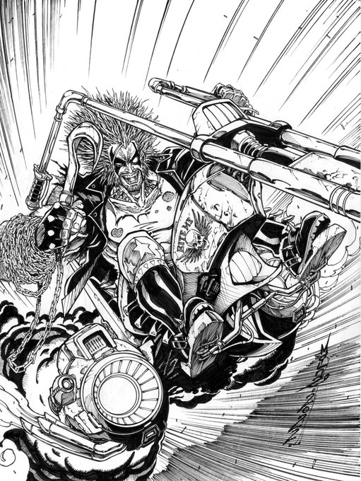 #Kayfabetober drawing 14 Lobo Insanely fun character to draw, also space bike :D #cartoonistkayfabe @DCComics @jimruggart @EdPiskor #Lobo #dccomics #bountyhunter #mercenary #drawing #ink