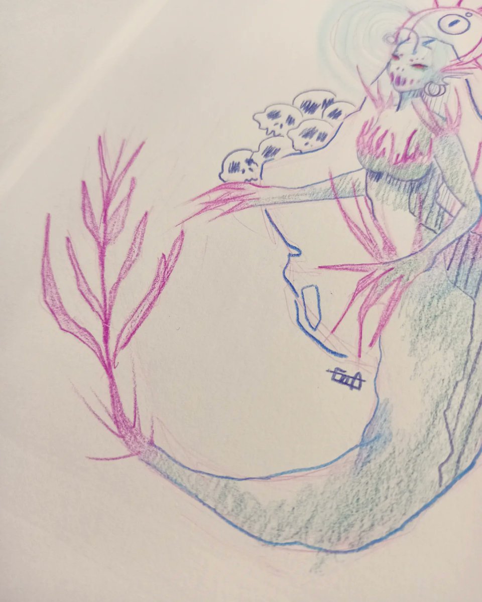 Día 91 de 365 Ran, la cazadora, en modo hechicera de las profundidades. Va a hacer un añito desde que me ayudasteis, en Twitch, a crear este personaje que tanto me gusta 🥺 . #365artchallenge #day91 #mermay #mermaid #mermaiddrawing #siren #darkmermaid #dark #evil #skull #sea