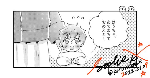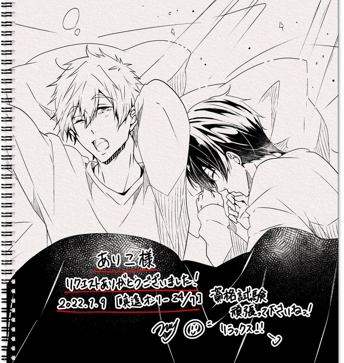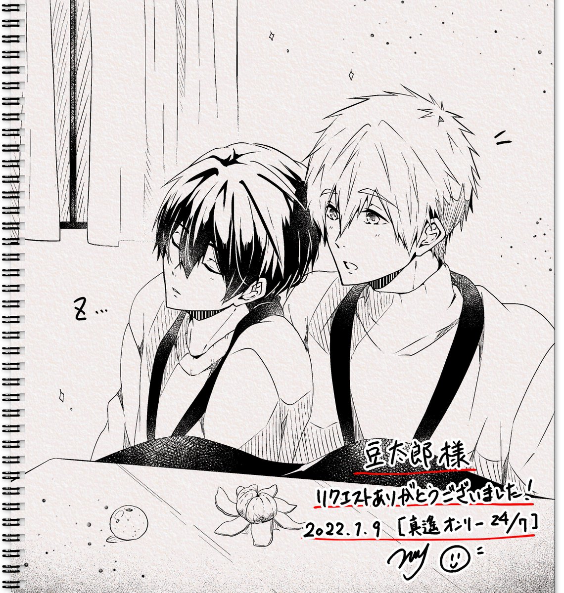 エアスケブ⑦ ありこ様(@Rainy__________)より、 【正月ボケしてるまこはるちゃん(試験応援メッセージ添え)】 ・中々起きられないまこはるちゃんです。 #mh24Seven_only #エアスケブ (幻のラスト😂)