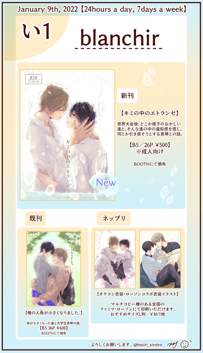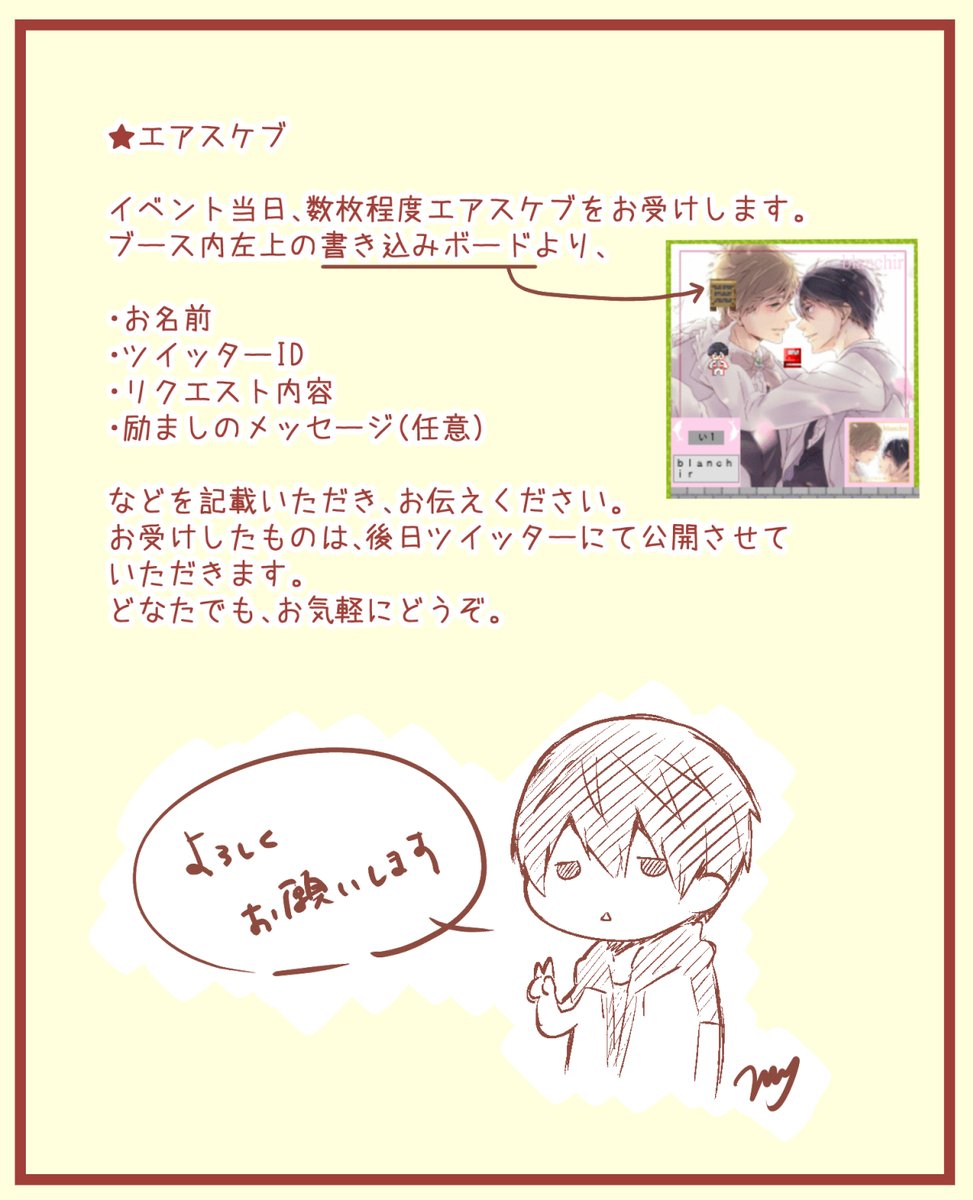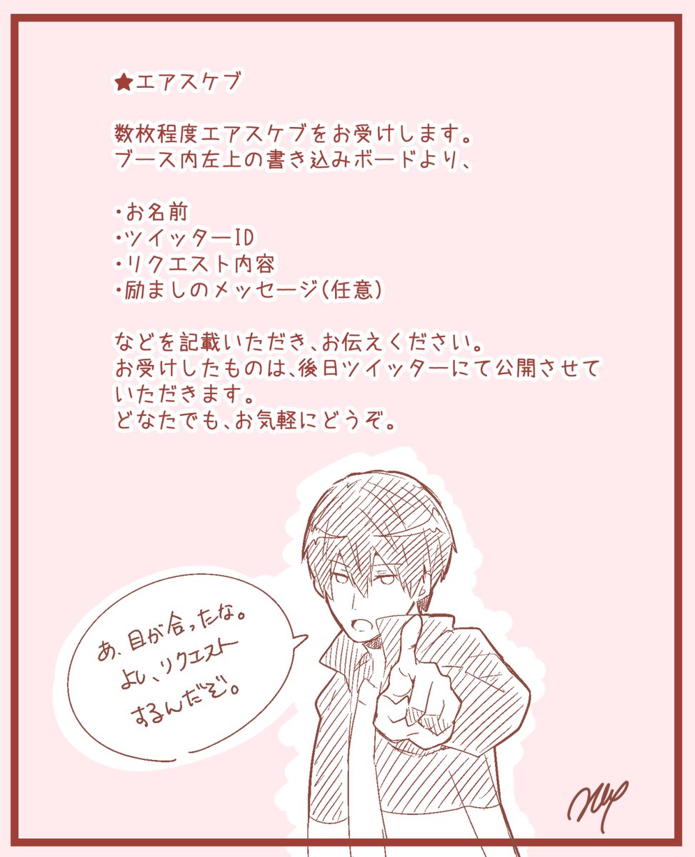 すみません、当日はイラスト展示のみとなってます。 配布物特にありません、すみません😖 当日本人はSPまたは会場内に居ると思いますのでもしよければエアスケブもやれればなと思ってます。 何もありませんがよろしくお願いします 。#mh24Seven_only