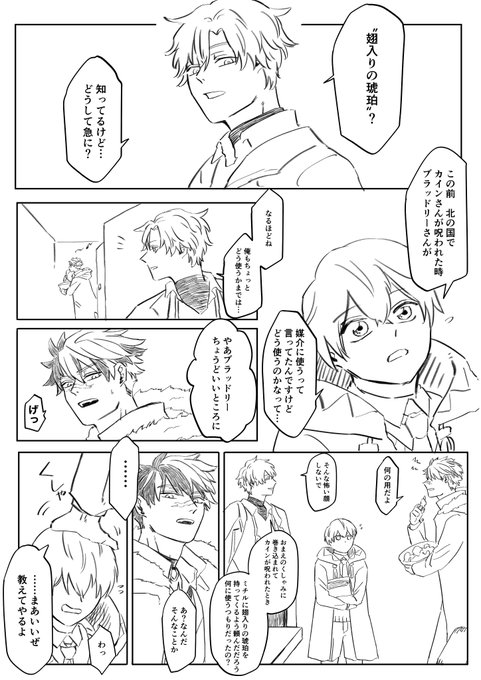 賢まほたちの眼球を偽造する際(どんな際?)に最適な媒介について、フィガロとボスとファ先生が雑談する漫画と設定テキストを展示してました。 引リツのローラン顕現漫画の続きになります。 1/3 #mhyk学会アフター twitter.com/nara_1225/stat…