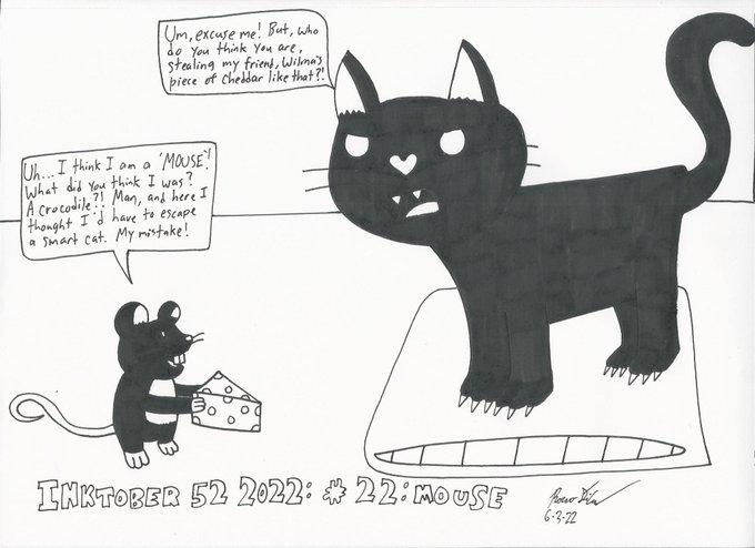 The first June #comic for this year's #inktober52 has Carl come face to face with a sneaky little: Mouse. #inktober52mouse #Inktober522022 #inktober2022 #inktober #art #artwork #drawings #artoftheday #penandinkdrawing #minchopigmentliner #wilmaandcarl