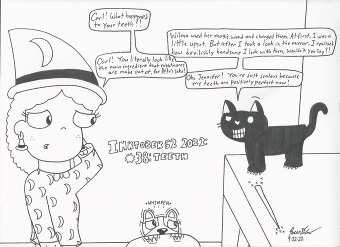 Today's #Inktober52 #comic, features Carl showing Jennifer and Tia his new conjured up, pearly white: Teeth! #inktober52teeth #inktober522022 #inktober2022 #Inktober #art #artwork #drawings #artoftheday #penandinkdrawing #minchopigmentliner #wilmaandcarl