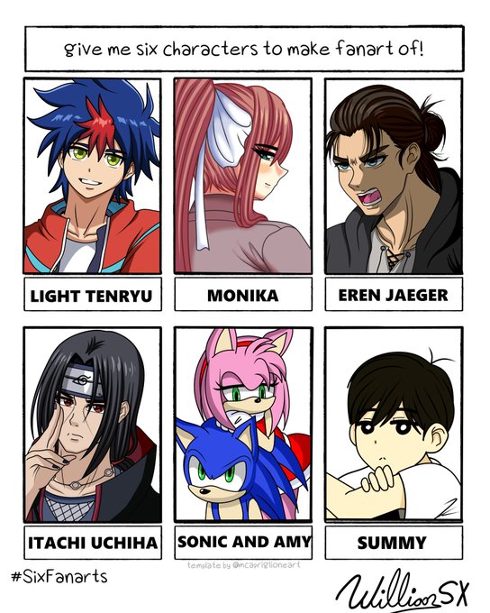 Finally finished the #SixFanarts challenge !! :D #LightTenryu #Shadowverse #Monika #DokiDokiLiteratureClub #Eren #AttackonTitan #ItachiUchiha #Naruto #Sonic #Amy #Sunny #Omori #Ess #YorForger #SpyxFamily #MidoriyaIzuku #BokuNoHeroAcademia #Nonna #Katyusha #MiuIruma #Uzakichan