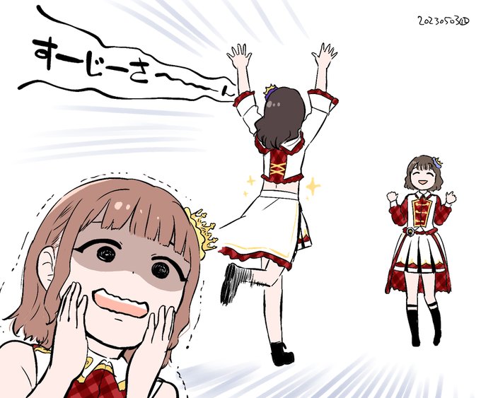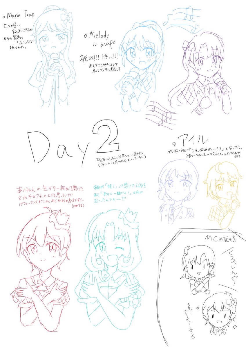2日目も描きました! プラリネ⇒アイルがメインです。プラリネもアイルも歌詞がリンクしているというか、メッセージ性が強いのも印象的で、元気づけられるんですよね。 他、合言葉はスタートアップで途中からオリメンの5色になる演出には息をのみました。超素敵。 #imas_ml_10th #ml_10th_act1_day2