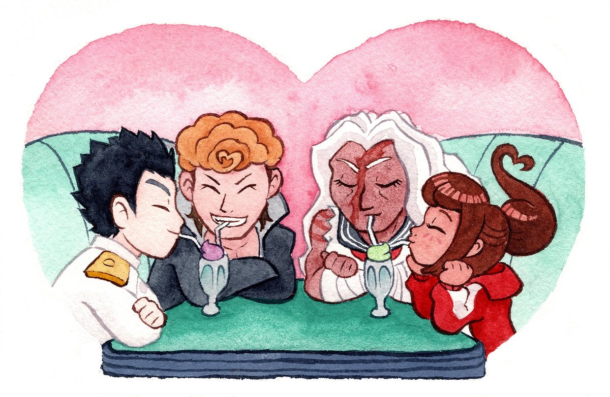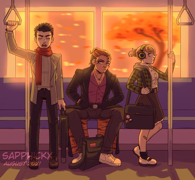 (1/2) my faves, all grown up, on the train, where will they go? ~🍂🍁💕 #danganronpa #kiyotakaishimaru #mondoowada #chihirofuijisaki #fanart #ArtistOnTwitter