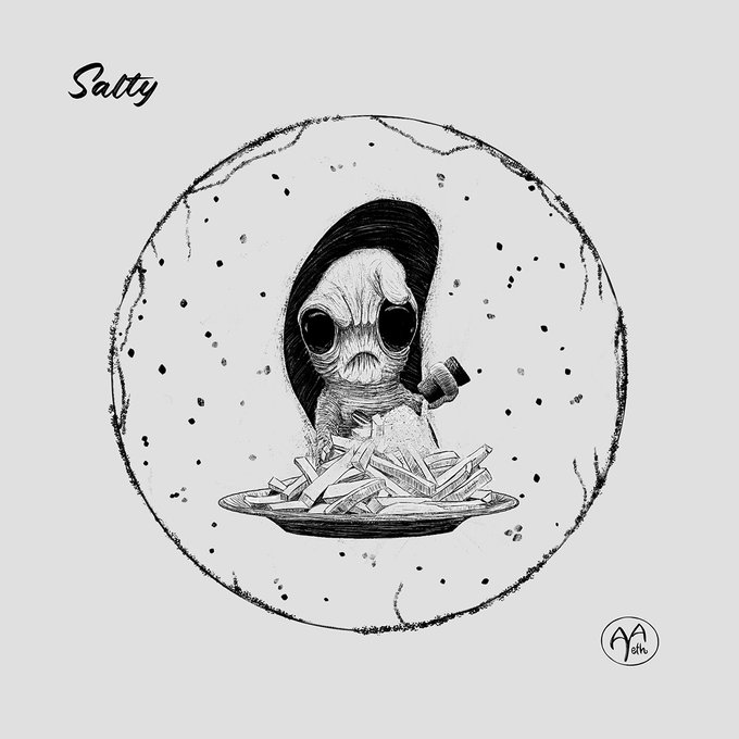 Inktober day 17 : Salty/salé Moule qui sale ses frites ----------------------------------------------- #Inktober #inktober2022 #inktoberday17 #illustrationart #artist #ArtistOnTwitter #blackandwhite #digitalart #paint #Photoshop #inktoberchallenge #monster