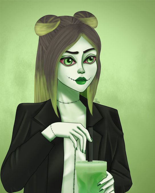 Her name is Jade Lattey it's a Matcha Latte witch 🍵, the illustration have been created for the #monstrouscafétober host by: @insanikei @femkedeborah_art @dasha.bune @omgleslie @nymeriaa_art @inesketches (On Instagram) #inktober #artchallenge #halloween #matchalatte #witchtober