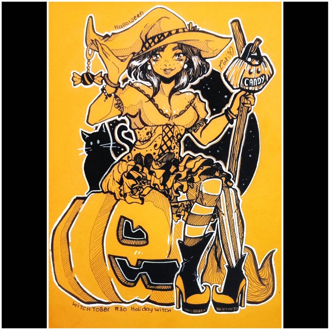 CatiWorks shared 'Day 30. Holiday Witch' on Ko-fi. ko-fi.com/i/IP5P8G0Z6J #witchtober #day30 #holidaywitch #halloween #halloweenwitch #pumpkin #blackcat #candy #inktober #inktoberwitchtober #catiworks #monthlychallenge #traditionalart #witchsociety #catiworks #catiswitchtober