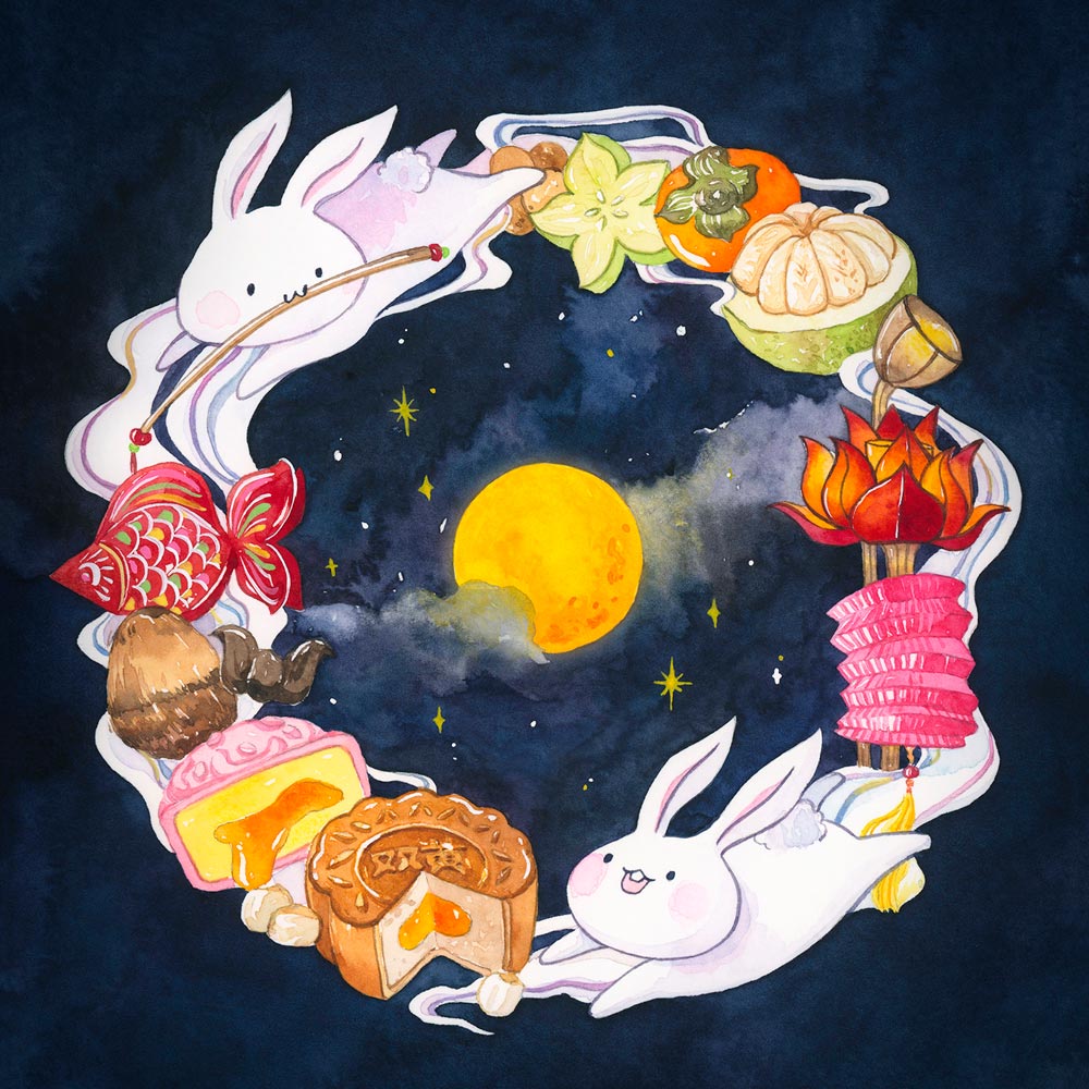 Happy Mid-Autumn Festival! 🐰🥮🌙 • #art #illustration #painting #watercolor #gouache #midautumnfestival #midautumn #moonfestival #mooncakefestival #中秋节 #中秋 #mooncakes #mooncake #change #moongoddess #moon #night #stars #autumn #fall #rabbit #chinese