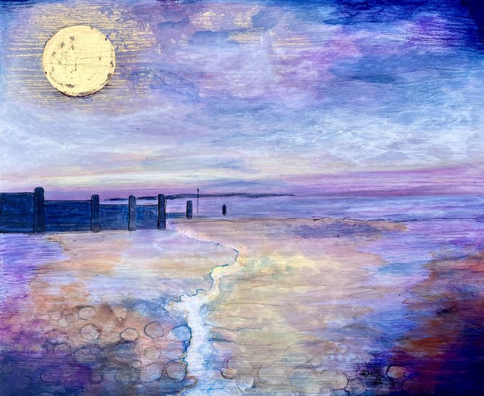 Did you see the Buck Moon this morning - large and bright in the sky? Just like this painted panel of a Whitstable Dawn with added gold leaf #BuckMoon #moonlight #Whitstable #seascape #landscape #ArtistOnTwitter #artist #goldleaf