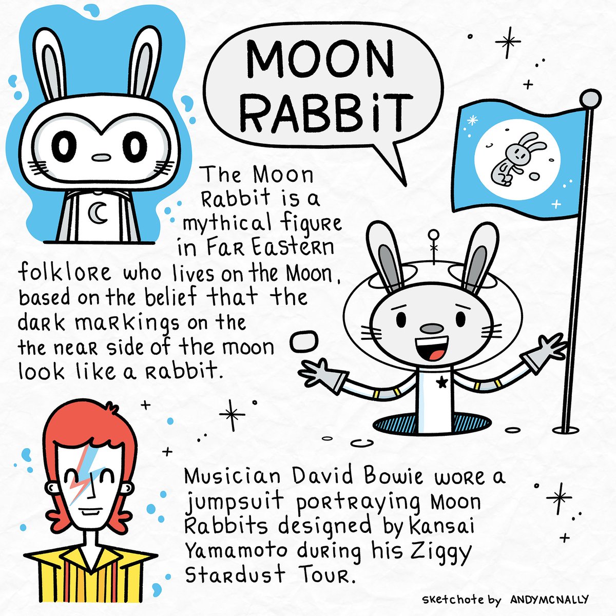 Moon Rabbit. In many mythologies around the world, there is a Moon Rabbit who lives on the moon. It is based on seeing the pattern of a rabbit in the shadows of the near side of the moon. #sketchnotes #illustration #moonrabbit #mythology #folklore #moon #davidbowie #moonknight