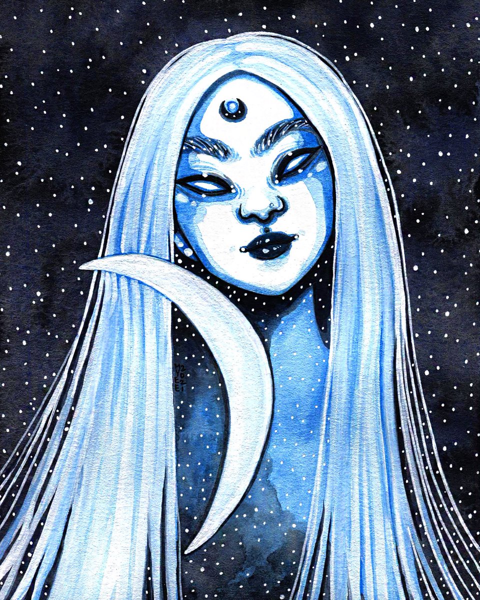 Prompt 4 : Moon Witch 🌙 for @heatherlime’s #HMYuleWitches21 art challenge! • #art #illustration #painting #watercolor #gouache #witch #moon #moonwitch #moongoddess #fantasy #fantasyart #stars #celestial #winter #yule #portrait #female #heathermahlerart #myeeart #theboneforest